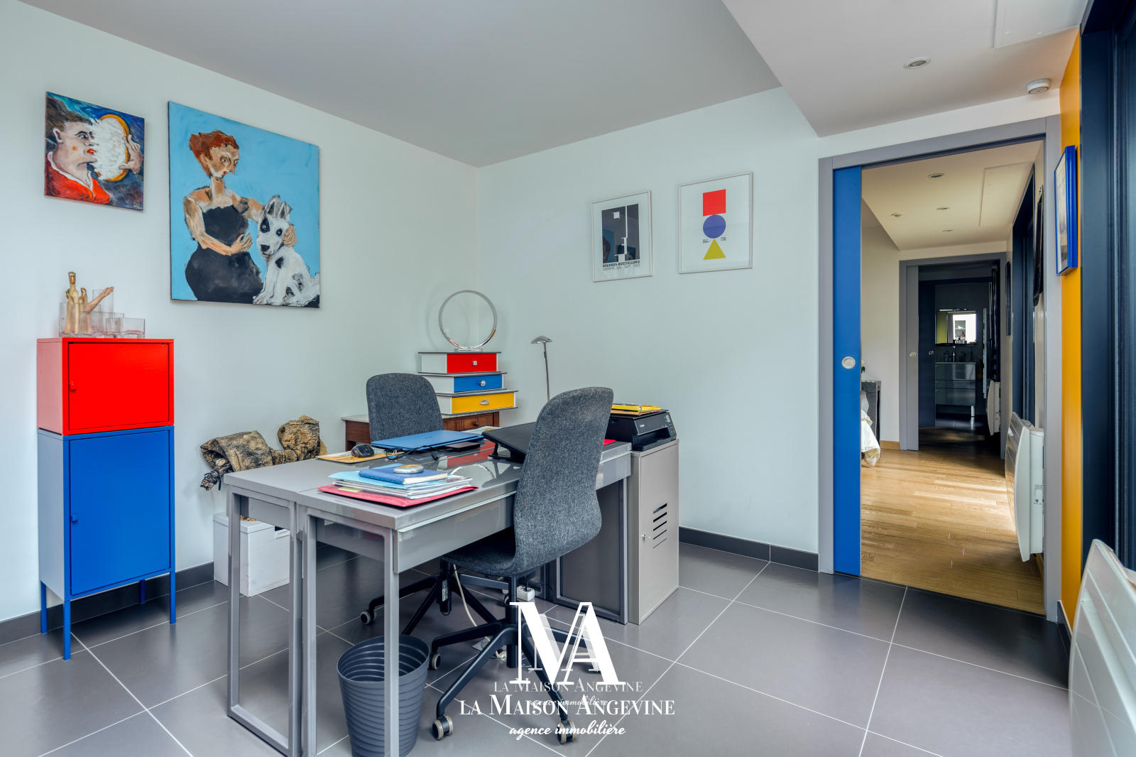 Au 1er étage un espace bureau, une chambre, une salle de bains.