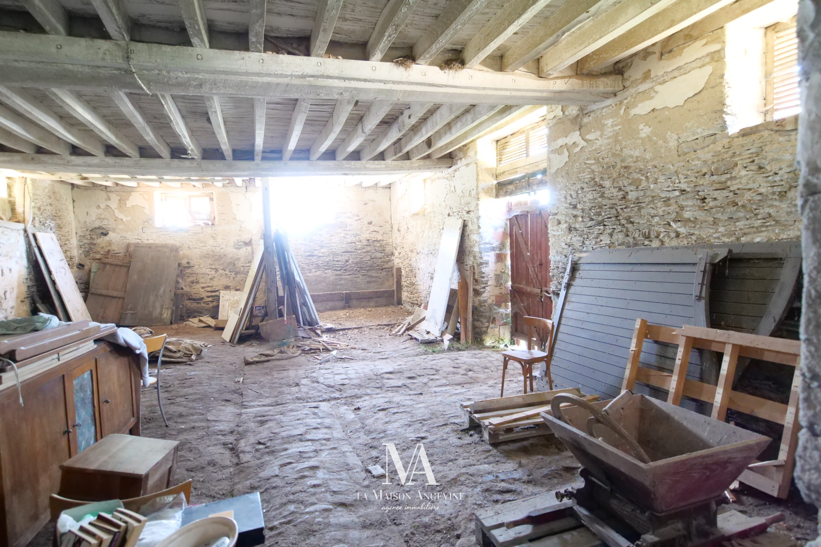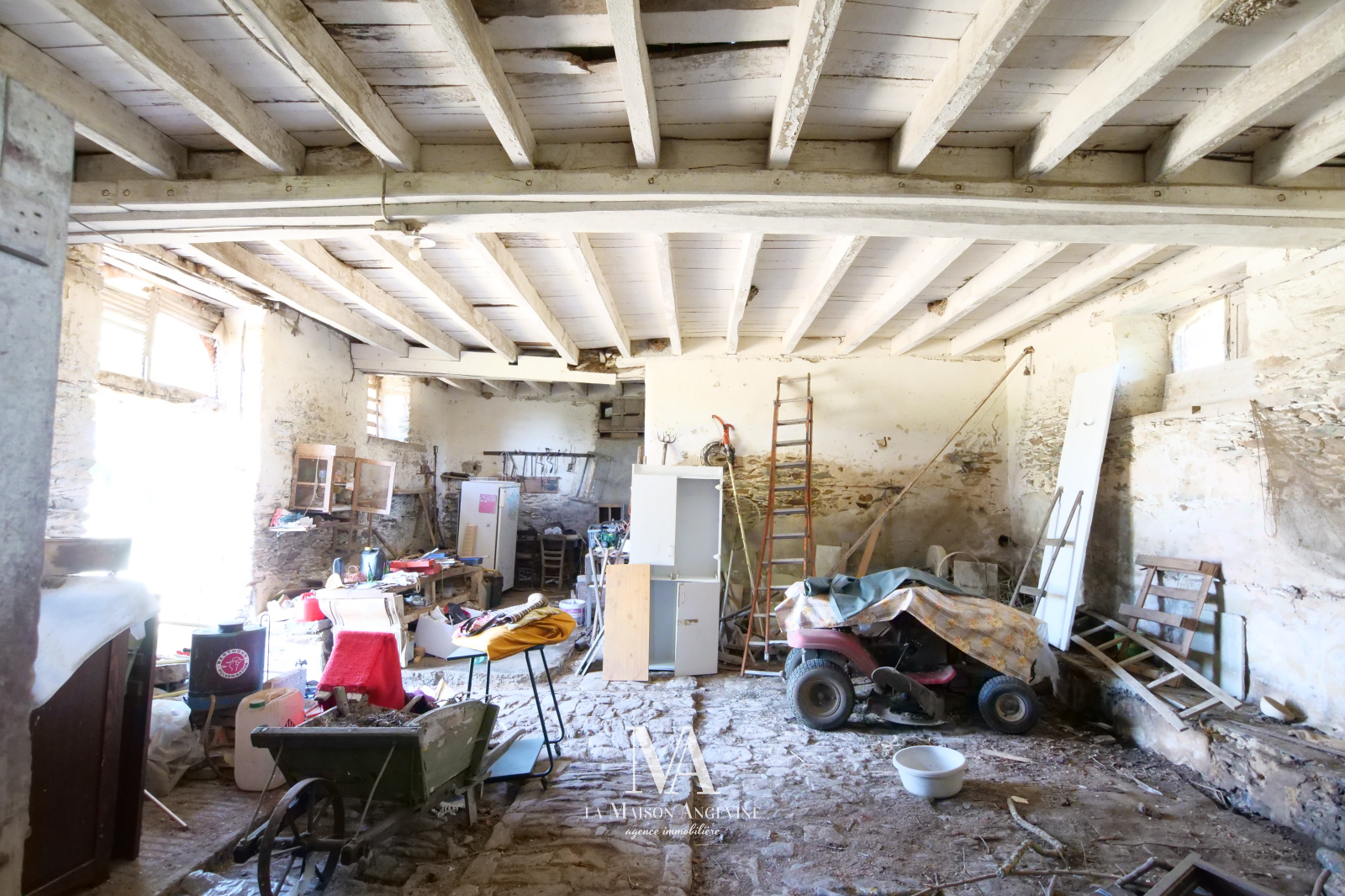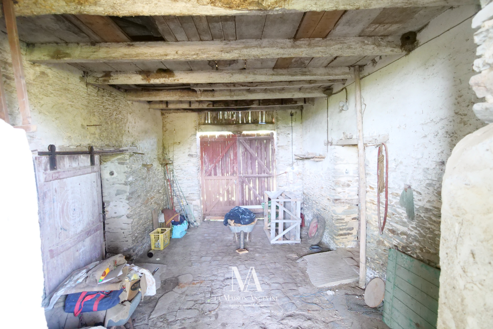 Très belle dépendance de 170 m² au sol, à rénover du sol au plfand. Maçonnerie et Charpente en très bon état. Grenier aménageable. Terrain d'environ 2300 m² avec étang (poss +), situé dans un bourg. A 20 min d'Angers.